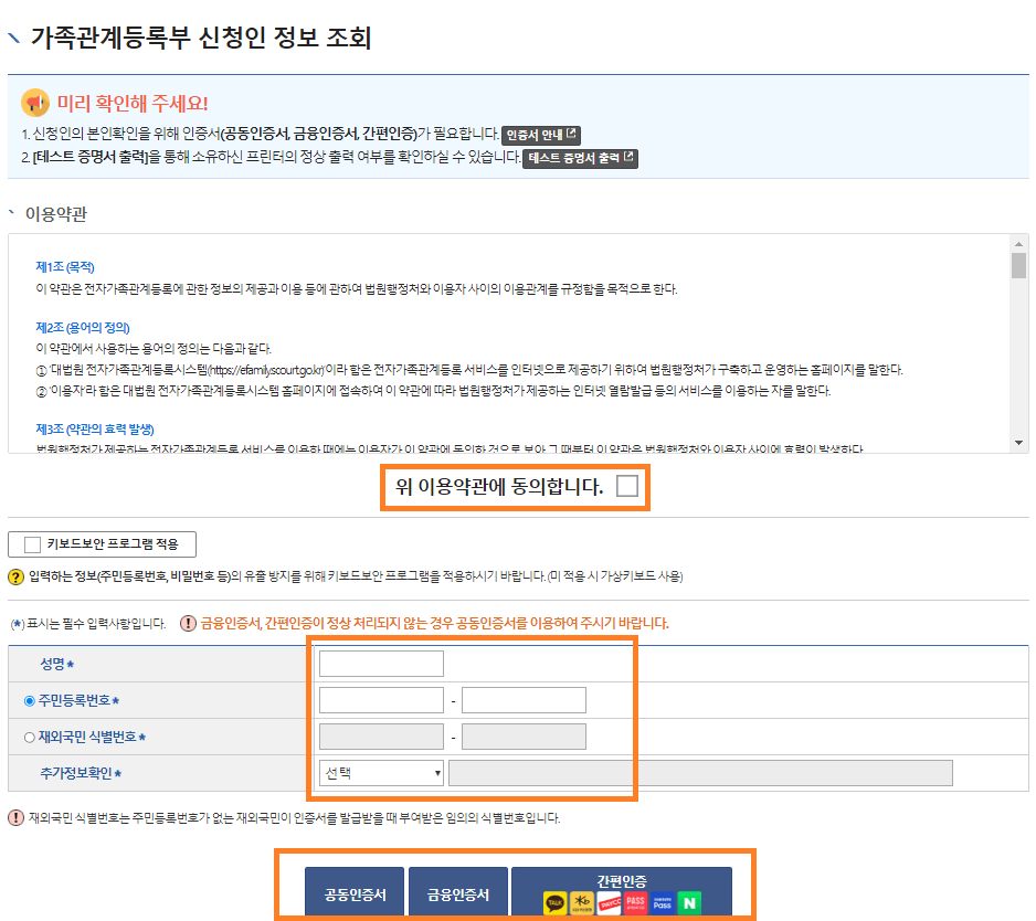 3️⃣ 이용약관 동의 체크 및 개인정보를 입력하고 공동인증서, 금융인증서, 간편 인증을 통해서 인증을 진행합니다.