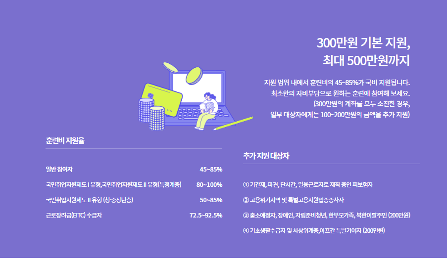 내일배움카드는 300만 원을 기본으로 지원하고 추가 지원금의 자격요건이 되는 사람들은 추가적으로 200만 원까지 추가 지원합니다.