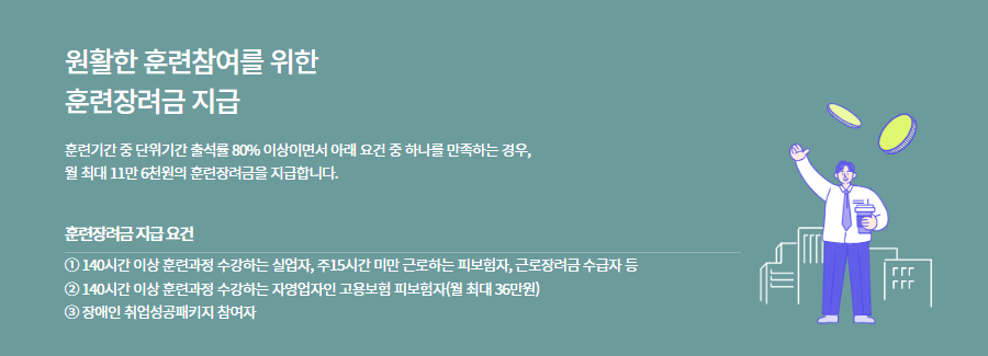 훈련기간 중 단위 기간 출석률이 80% 이상인 경우, 아래 요건 중 하나를 만족하는 경우 월 최대 11만 6천 원의 훈련장려금을 지급합니다.
