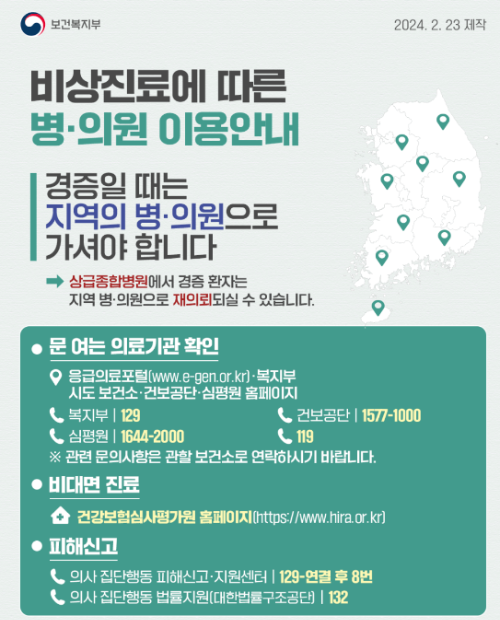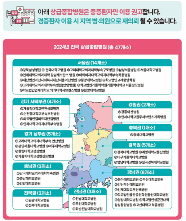 비상진료에 따른 병의원을 이용하는 방법은 경증환자는 지역 병의원으로 가야 하고, 중증환자는 상급종합병원으로 가셔야 야합니다. 경증환자가 상급종합병원으로 가실 경우 돌려보내지실 수 있다는 이야기입니다. 그러므로 중증환자만 상급종합병원으로 가시기 바랍니다.