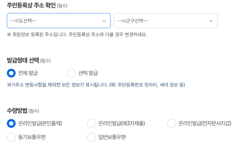 3️⃣자신이 거주하고 있는 주소를 선택하고 발급형태, 수령방법을 선택하여 '신청하기'를 누릅니다.